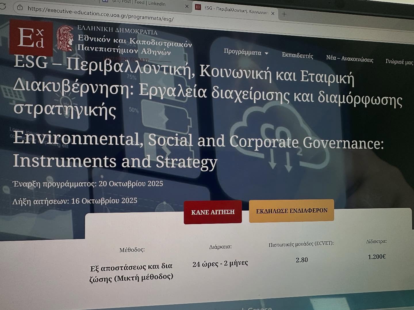 #esg executive education ΕΚΠΑ – για τριτη συνεχομενη χρονια συμμετεχω στο ESG Προγραμμα του Executive Education του ΕΚΠΑ με τον Καθ. Ανδρεα Παπανδρεου και αλλους εκλεκτους Ακαδημαικους, αλλα κυριως επαγγελματιες του ESG. Για περισσότερες πληροφορίες δείτε εδώ – https://executive-education.cce.uoa.gr/programmata/esg/…